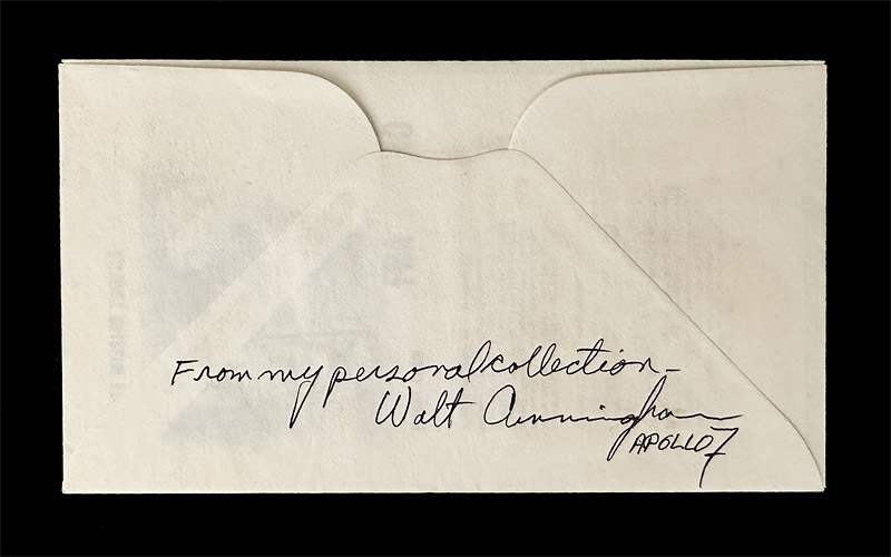 Photo captured before framing of the rear side of the cover showing it comes from Apollo 7 LMP, Walt Cunningham's personal collection