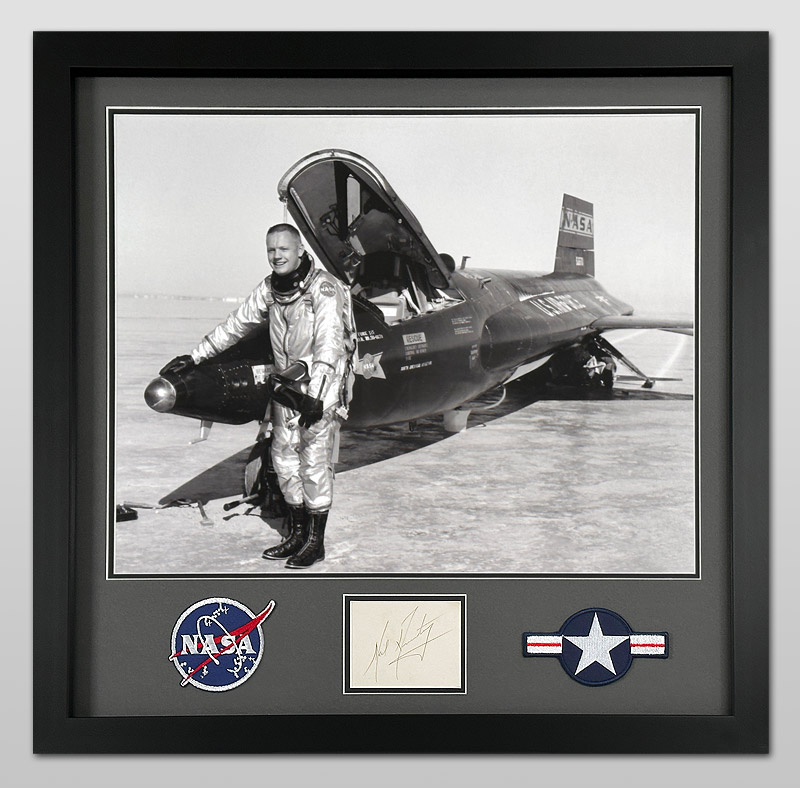 A magnificent large framed piece featuring a Neil Armstrong signed card bearing his early 60's autograph style while he was a test pilot at Edwards Air Force base flying the X-15 rocket plane. The card has been archivally framed below a 20x16 inch photo of Armstrong beside the X-15 on the lake bed at Edwards.