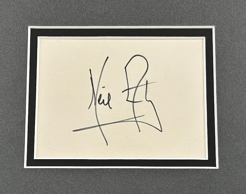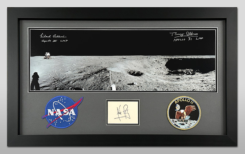 A magnificent large framed piece featuring signatures from all 3 Apollo 11 Crew members, Neil Armstrong, Buzz Aldrin and Michael Collins. The Armstrong is on a matted off-white card, and the Aldrin and Collins are signed in silver on a 23x8 inch panoramic photo of one of the only large features at the Apollo 11 landing site, the 30m wide 'Little West Crater' also know as 'East Crater'. It had not been planned to photograph this crater, but Neil Armstrong took it upon himself to travel over and capture a partial panorama of it.